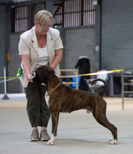 LD (5,0) 1st Van-Beck’s Newlaithe Respect such a well balanced, well constructed dog. Medium sized and square with copybook angulation both ends. Correctly sloping topline. Good neck flowing seamlessly in at the withers. You never catch him standing wrong. Head of decent length and balance with good width of muzzle. Could do with just a shade more rise of skull. Good eye and expression. Sound mover who covers lots of ground in profile. Such a good overall Boxer and I was delighted to award him his first RCC. He will be a very worthy champion. (Tim Hutchings)
